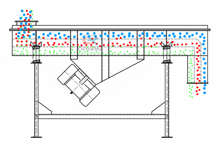 上振式直線振動(dòng)篩是利用振動(dòng)電機(jī)或普通電機(jī)外拖動(dòng)或自振源驅(qū)動(dòng),使篩體沿激振力方向作周期性往復(fù)振動(dòng),物料在篩面上沿直線方向作拋物線運(yùn)動(dòng),從而達(dá)到篩分目的。上振式直線振動(dòng)篩由激振裝置、篩箱、防塵罩、落料斗、減振裝置、底座等部分組成。上振式直線振動(dòng)篩工作時(shí),由激振器產(chǎn)生的激振力通過篩箱傳遞給篩箱內(nèi)的篩面上,因激振器產(chǎn)生的激振力為縱向力,迫使篩箱帶動(dòng)篩網(wǎng)面作縱向前后位移,在一定條件下,篩網(wǎng)面上的物料因受激振力作用而被向前拋起,落下時(shí)小于篩孔的物料則透篩而落到下層,物料在篩網(wǎng)面上的運(yùn)動(dòng)軌跡為拋物運(yùn)動(dòng),由于這樣周而復(fù)始的物料運(yùn)動(dòng),物料從入料端落入篩箱后,迅速前進(jìn)、松散、透篩,完成篩分作業(yè)。