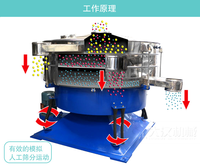旋振篩,其原理是:瞬時運動為沿徑向的位移和以此位移為軸的圓周運動的合成(螺旋運動)。即可調(diào)節(jié)偏心距的激振器產(chǎn)生了非線性三維運動,物料也產(chǎn)生同樣的近似手動作業(yè)的運動,從而達到篩分之目的,再配合篩分附件可得到更加理想的篩分效果;適合于圓球狀、圓柱狀、片狀、乃至不規(guī)則形狀易堵網(wǎng)且需要精密篩分的物料。